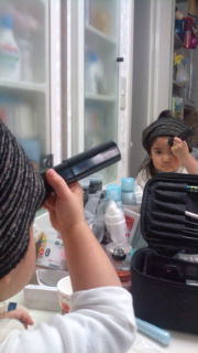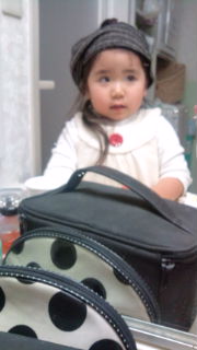 でも、朝はまずお化粧からってな具合で私がお化粧をしていたら、私のヘヤーバンドまてまねて、こんな感じ。女の子ってすごいですね。