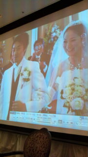週末の披露宴では、新郎の同僚の方が、教会での式の写真をすぐにこのように余興で使われて好評でした。